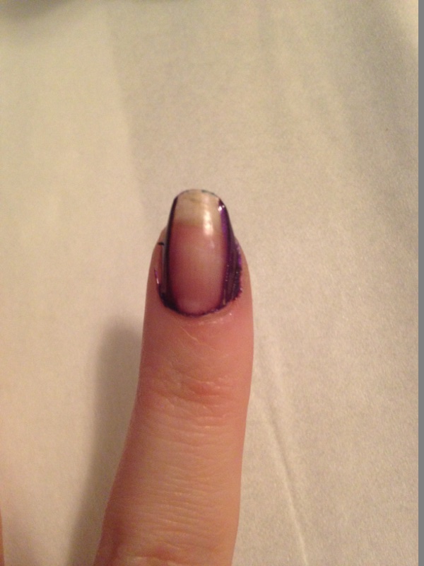 Using a paper towel wipe off the top of the nail only. This step is a little tricky and leaves a lot of room for variation. It helps to let the polish dry just a little so it leaves some purple on the top and the edges blend a little better. But if you want it to look sharp you can do that too. Leaving it light in the middle is the key to making the color pop.![]() |
